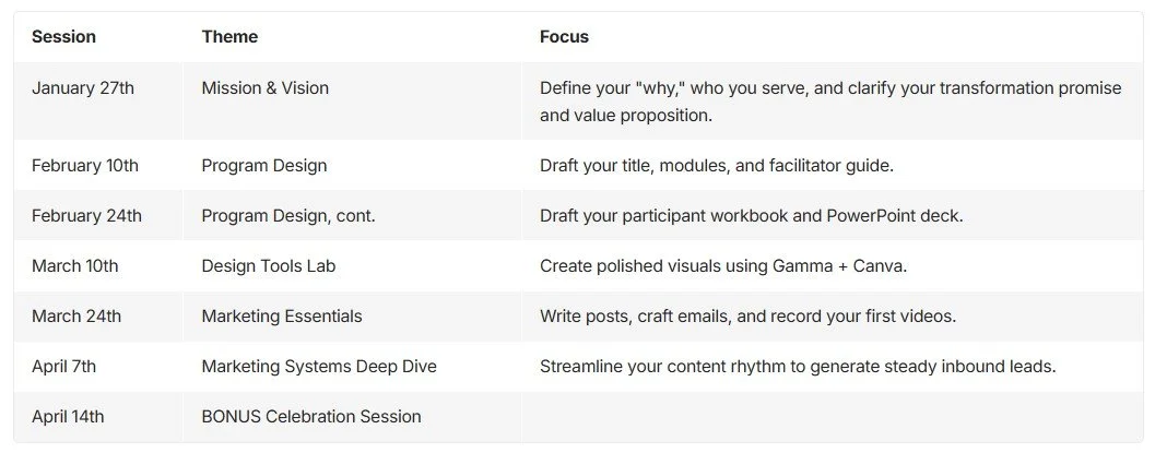 These sessions create accountability, collaboration, and clarity — ensuring you actually finish and launch your program.